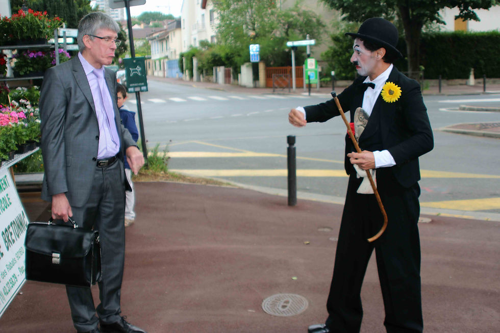 Une véritable performance d'acteur ! L'artiste joue avec le talent des passants, qu'il suit, caricature et imite. il met en scène le public, prend la main d'un couple qui marche ensemble se mettant à la place de l'autre, il fait aussi la circulation, rentre dans les magasins ... C'est un artiste complet pour tout public et qui plait à tous, les grands comme les petits ! Toujours là où on ne l’attend pas, il sait créer l’inattendu et chaque passant est gentiment piégé. L'étonnement et le rire sont au rendez vous. Idéal pour les animations de marchés (marchés de noël, marchés gourmands, marché aux fleurs ... ...), fêtes de centres villes, les grands rassemblements ou même pour faire patienter le public dans les files d'attente (aéroports, gares etc ...)